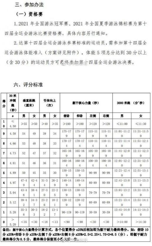 游泳项目的体能测试中,测试项目包括3000米跑、30米冲刺跑、垂直纵跳、引体向上和躯干核心力量。体能5项总分达到30分以上 (含30分)的运动员方可最终参加第十四届全运会游泳决赛。
