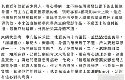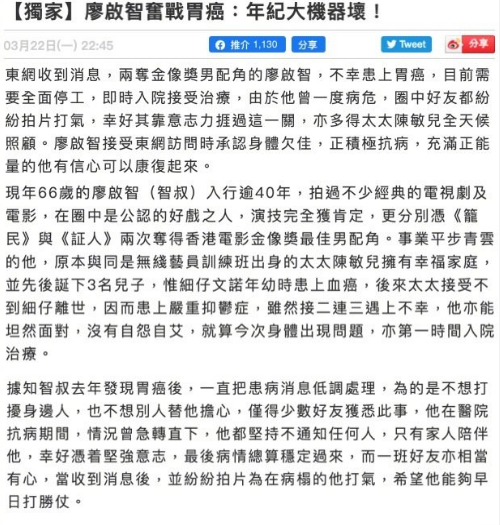 3月22日,据港媒报道,廖启智去年发现患胃癌 ,全面停工入院接受治疗。但为了不打扰身边人,廖启智一直将患病消息低调处理。 他曾一度病危,圈中好友都纷纷拍摄视频为他打气。当时,廖启智在受访时承认身体欠佳,正在积极治病,有信心能康复起来。廖启智患胃癌被曝光后,经纪公司曾发声明感谢大家关心,“他现正接受专业治疗和有家人悉心的照顾,请大家放心。智叔一向处事低调,不愿多谈私人问题。恳请各位给予尊重和空间,让他可以安静调理身体,早日康复,也让智叔家人可以专心照料他。”