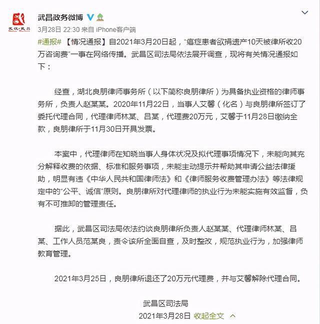 据@武昌政务微博3月28日晚消息,自2021年3月20日起,“癌症患者欲捐遗产10天被律所收20万咨询费”一事在网络传播。武汉市武昌区司法局依法展开调查,现将有关情况通报如下: