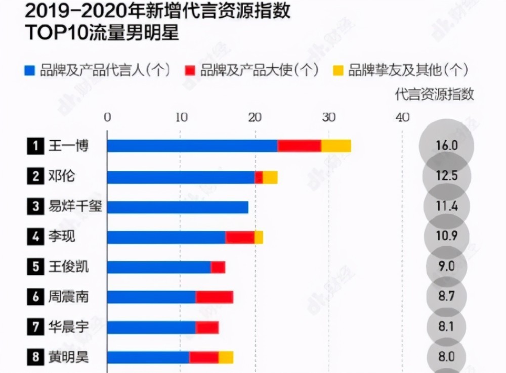 小说改编剧《陈情令》大爆后,剧中饰演双男主之一的王一博很快就成为了很多品牌代言方争相追捧的对象。2019年—2020年,王一博直接凭借着两年30+个代言的数量,夺得了流量明星排行榜的冠军的宝座。不禁让人感叹:不愧是王一博。