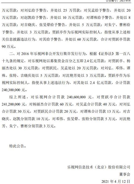 其中,针对2016年乐视网非公开发行欺诈发行行为,根据《证券法》相关规定,证监会对乐视网处以募集资金百分之五即2.4亿元罚款;并对贾跃亭、时任乐视网财务总监杨丽杰处以30万元罚款等。贾跃亭作为乐视网实际控制人,指使从事违法行为,对其处以2.4亿元罚款,合计罚款2.403亿元。