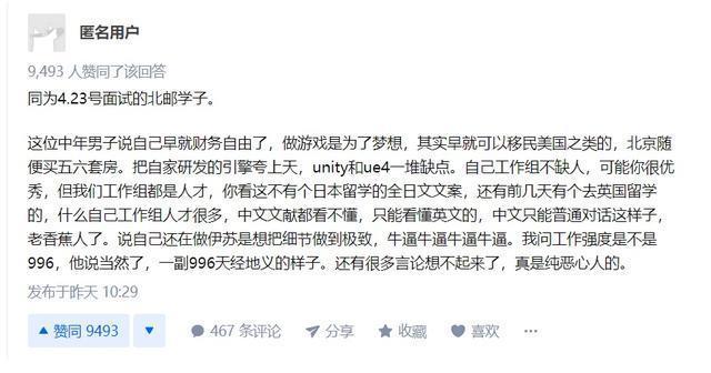 另有匿名的知乎网友发帖称,是同为4月23日面试的北邮学子,其表示:“这位中年男子说自己早就财务自由了,做游戏是为了梦想,其实早就可以移民美国之类的,北京随便买五六套房。自己工作组不缺人,可能你很优秀,但我们工作组都是人才,你看这不有个日本留学的全日文文案,还有前几天有个去英国留学的,什么自己工作组人才很多,中文文献都看不懂,只能看懂英文的,中文只能普通对话这样子。我问工作强度是不是996,他说当然了,一副996天经地义的样子。”