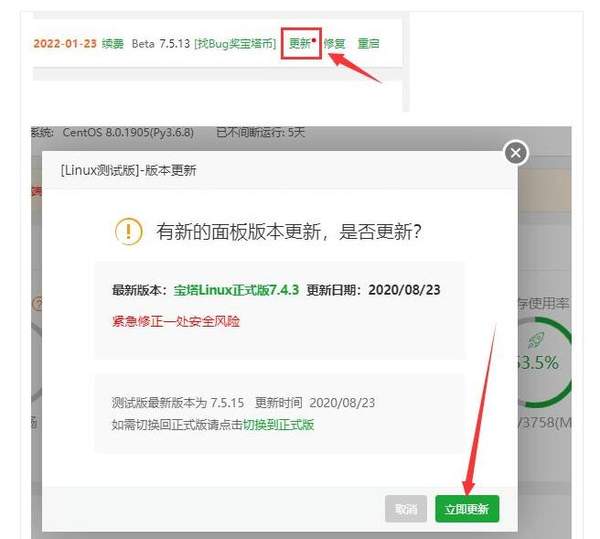 据了解,此次更新是为了修复 phpmyadmin 未鉴权,可通过特定地址直接登陆数据库的严重 Bug 。目前,用户可登录面板后台,右上角点击更新,弹窗后,点击立即更新,进行更新。