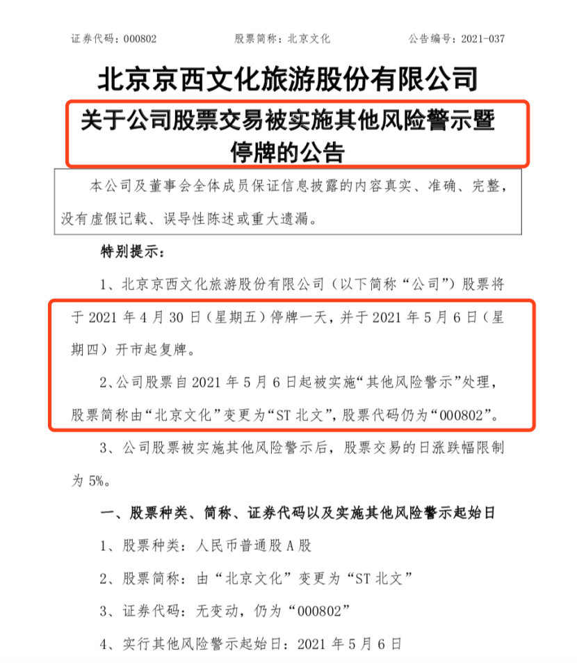 因此,北京文化宣布2021年5月6日公司股票复牌后将被实施其他风险警示。