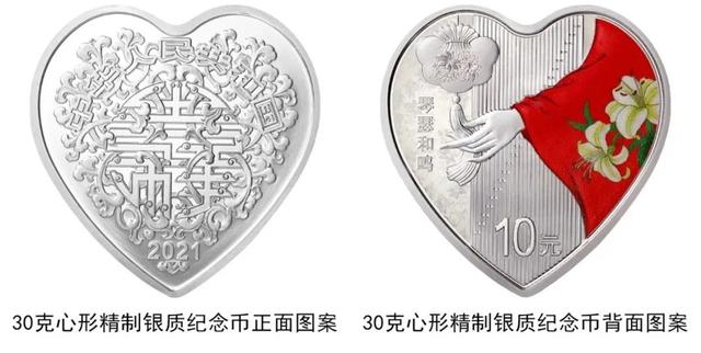 据中国人民银行官网消息,人民银行自5月9日起发行2021吉祥文化金银纪念币一套。该套金银纪念币共7枚,其中金质纪念币3枚,银质纪念币4枚。其中有两枚心形纪念币将在5月20日发行。