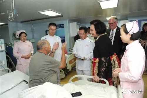 汤加公主(黑衣彩裙)还到“和平方舟”欢迎中方人员并看望正在接受治疗的国民。