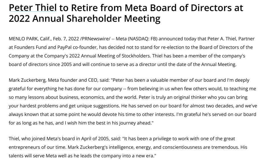 财联社(上海,编辑 史正丞)讯,当地时间周一,Meta Platforms发布公告宣布,硅谷科创风投明星彼得·泰尔(Peter Thiel)将于今年股东大会后退出董事会。彼得也是这家社交媒体巨头的早期投资人,以及董事会中效力时间最长的外部董事。