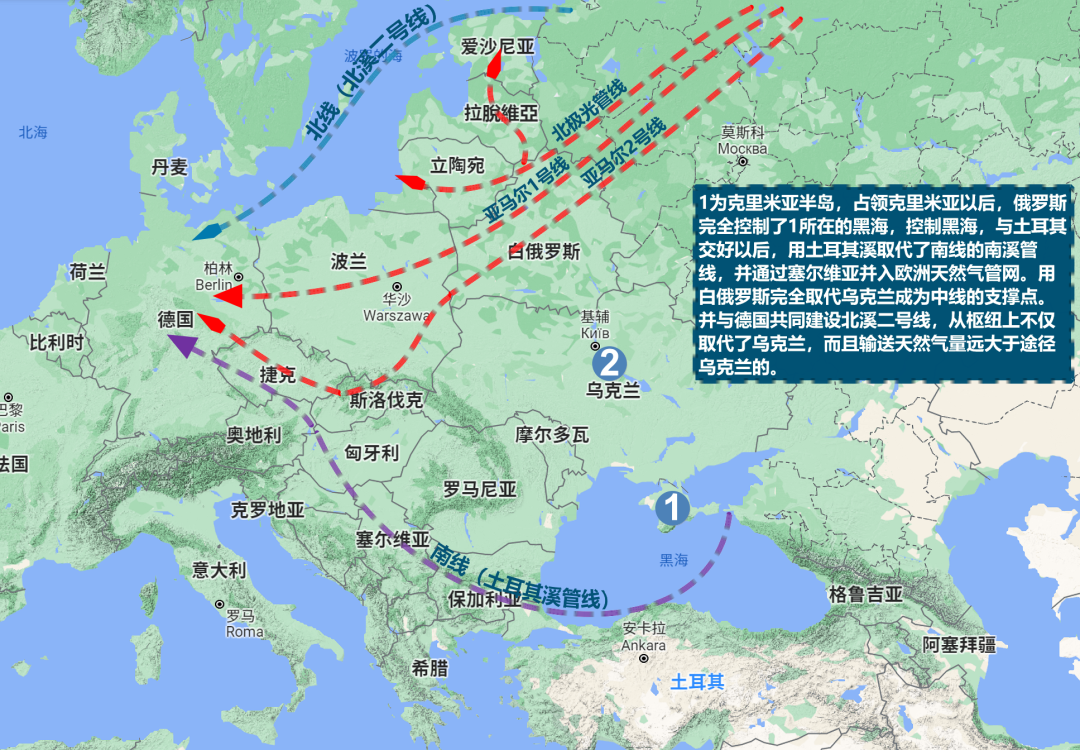 俄罗斯强势夺回克里米亚半岛以后,黑海舰队就不用搬离这里,俄罗斯更是修建了克赤海峡大桥,将所剩无几的乌克兰海军逼到了封闭的亚速海。因为克里米亚半岛深入黑海,控制这里就等于控制整个黑海,所以,2013年后的8年时间里,俄罗斯修建了穿越黑海的土耳其溪管线,并建设了从土耳其穿越塞尔维亚进入欧洲的巴尔干溪管线,这两条管线正式将俄罗斯对欧洲能源出口的南线打通。与此同时,俄罗斯与德国合作建设的北溪二号线也穿越波罗的海直达德国境内。
