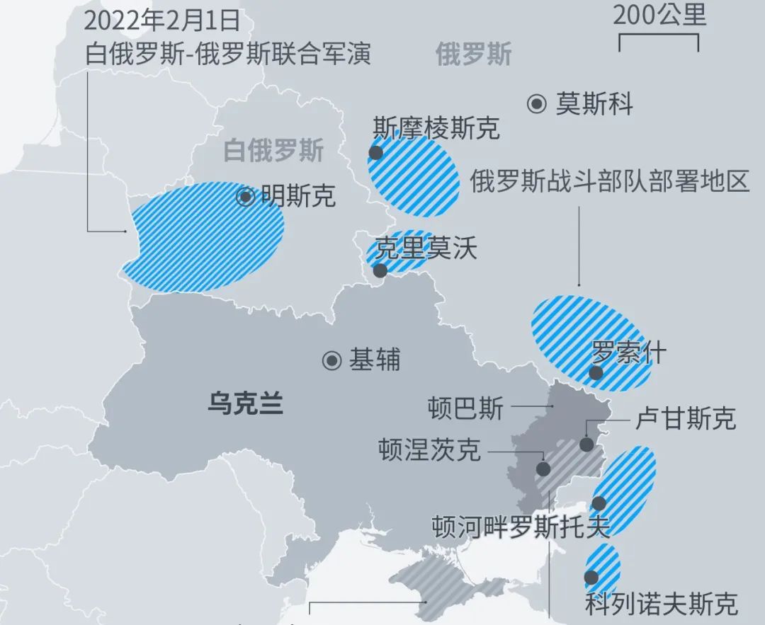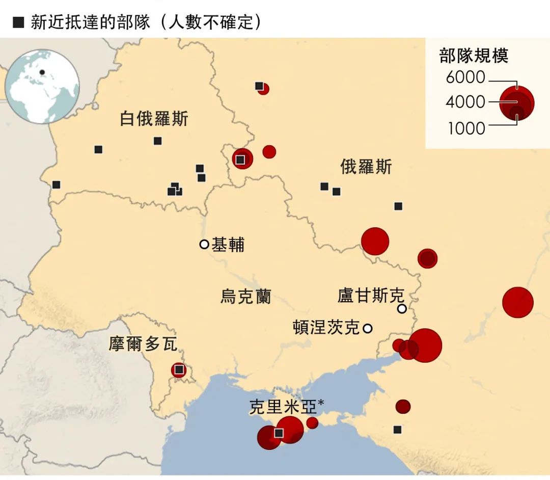 上图为俄罗斯在乌克兰周围的军事部署