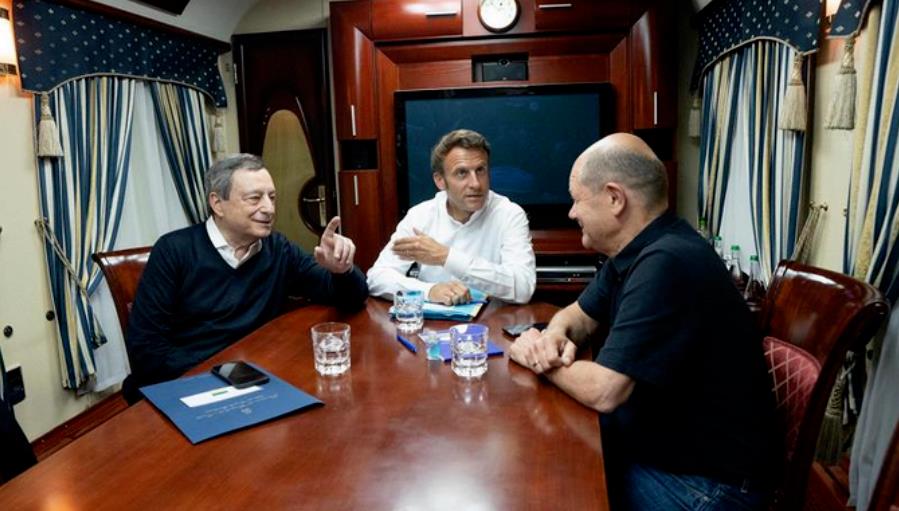 如此大的阵仗,是法国总统马克龙、德国总理朔尔茨、意大利总理德拉吉,欧盟三巨头从波兰边境乘坐火车入境基辅。