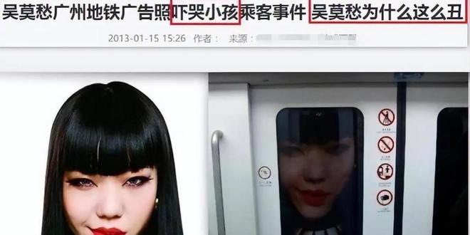 据说2013年的一天,在广州地铁站的一个小孩儿被车门上吴莫愁的海报吓哭,这件事直接让吴莫愁登上了“亚洲最丑女星排行榜”的首位。