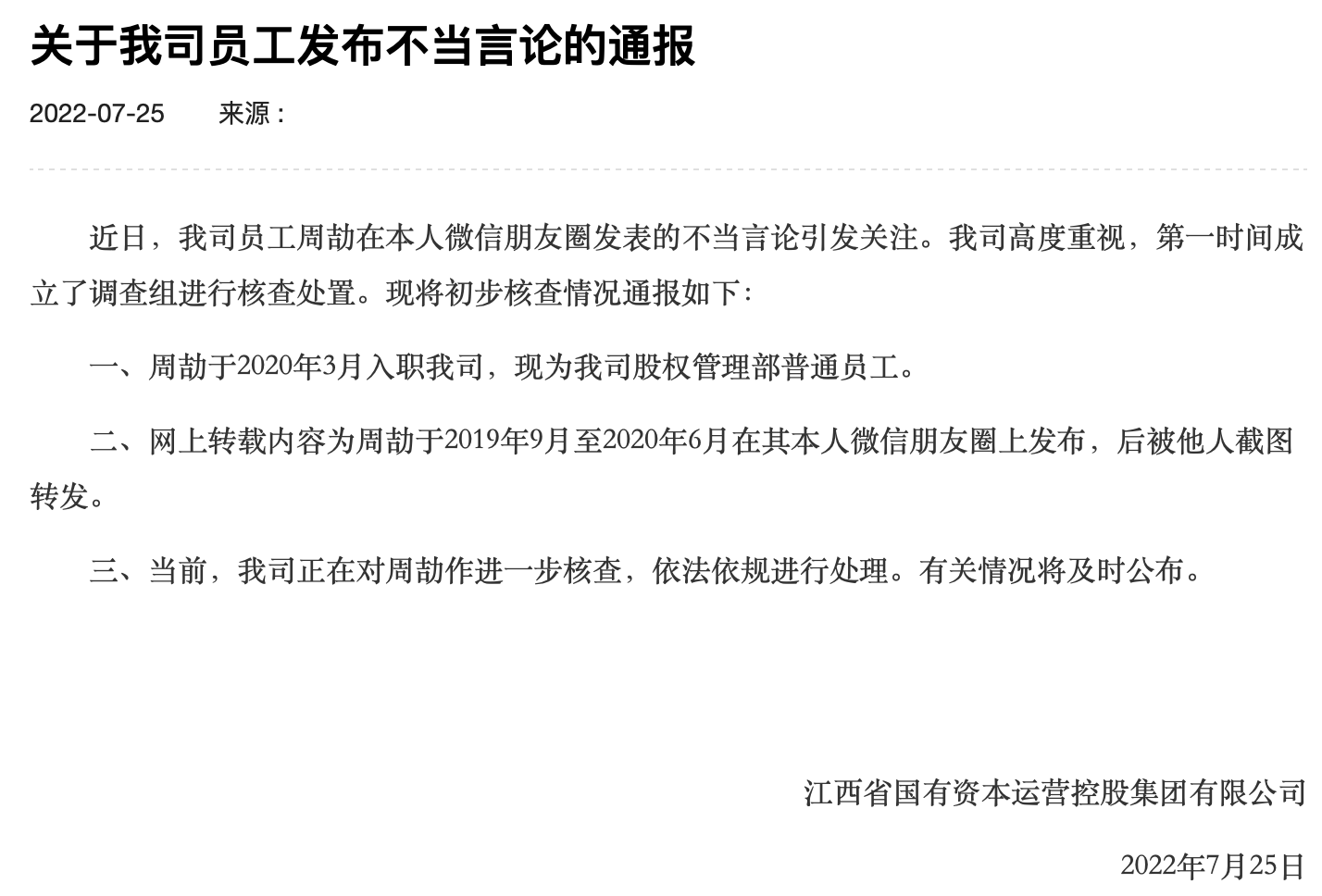 7月25日,江西国控在其官网发布声明称,周劼于2020年5月入职,现为公司股权管理部普通员工,当前正对其作进一步核查。