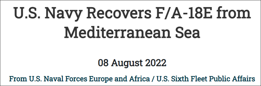 新闻稿称,这架“超级大黄蜂”战斗机是在7月8日被大风从航母甲板上刮进地中海。当时“杜鲁门”号航空母舰正在意外的恶劣天气中执行补给任务。
