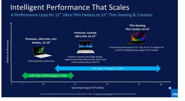 英特尔发布了 11 代酷睿移动处理器,分为 UP3 和 UP4 两个系列,两个系列都没有固定的 TDP 值,前者为 12-28W,后者为 7-15W。