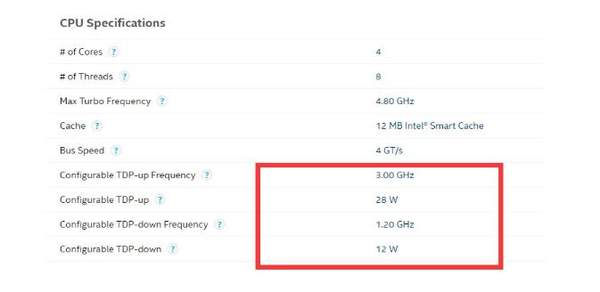 汇总消息,英特尔官网上也不再标注固定的 TDP,而是分为 TDP-up 和 TDP-down,如 i7-1185G7 在 28W 的 TDP-up 时主频为 3GHz,在 12W 的 TDP-down 时,频率为 1.2GHz。