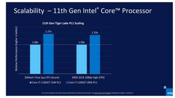 根据英特尔官方数据显示,11 代酷睿 i7-1185G7 在 28W 功耗下的性能是 15W 功耗的 1.3 倍以上。