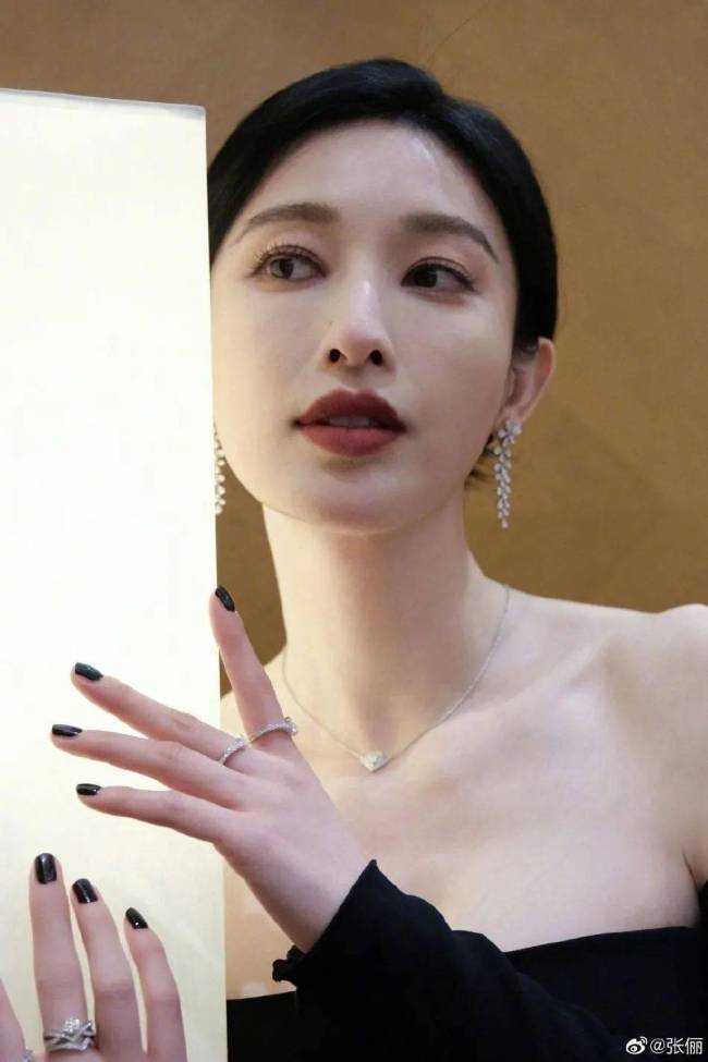 张俪身穿一身黑色一字肩礼服,她俏脸成熟妩媚,眉清目秀,唇红齿白,耳朵和脖子上都戴着名贵的首饰,大秀白皙的香肩,肌肤娇嫩如雪,美得不可方物。