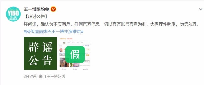 【网传迪丽热巴王一博主演电视剧《难哄》已辟谣】24日,网传迪丽热巴王一博主演难哄引起热议。刚刚,王一博粉丝后援会发文表示:“经问询,确认为不实消息,任何官方信息一切以官方账号官宣为准,大家理性吃瓜,勿信勿理。”