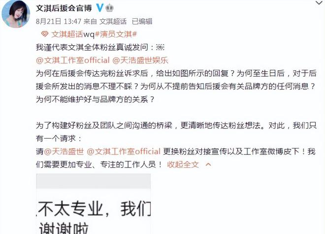 对此,后援会要求更换粉丝对接宣传和工作室微博的皮下工作人员,并在微博艾特了文淇工作室与经纪公司。两天后,工作室也在微博发布了长文回应,解释了“不专业”说法的来龙去脉。