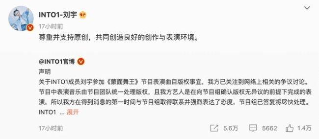 随后刘宇转发声明并呼吁,尊重并支持原创,共同创造良好的创作与表演环境。