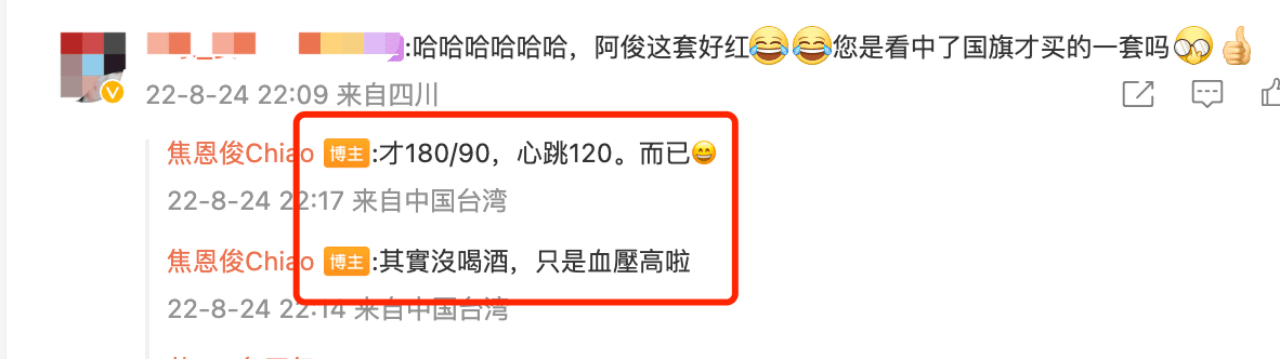 面对大家的猜测,焦恩俊直接亲自下场“澄清”,否认了自己脸红是因为醉酒,更是霸气回应,称自己“只是血压高”,甚至还公开了自己的血压数值(正常值是140/90),并用“而已”两字来形容,言语间满是不在乎。