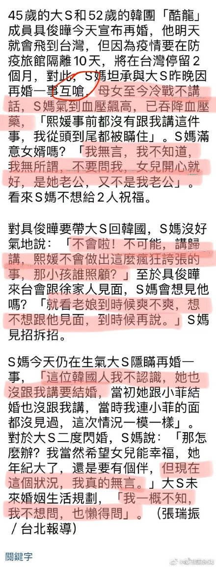 爆料中更是表示,S妈不但和大S吵了一架,还被气到血压飙升,喝了降压药后才得以缓解,并表示自己不会祝福两人、不认识具俊晔、不会和对方见面。
