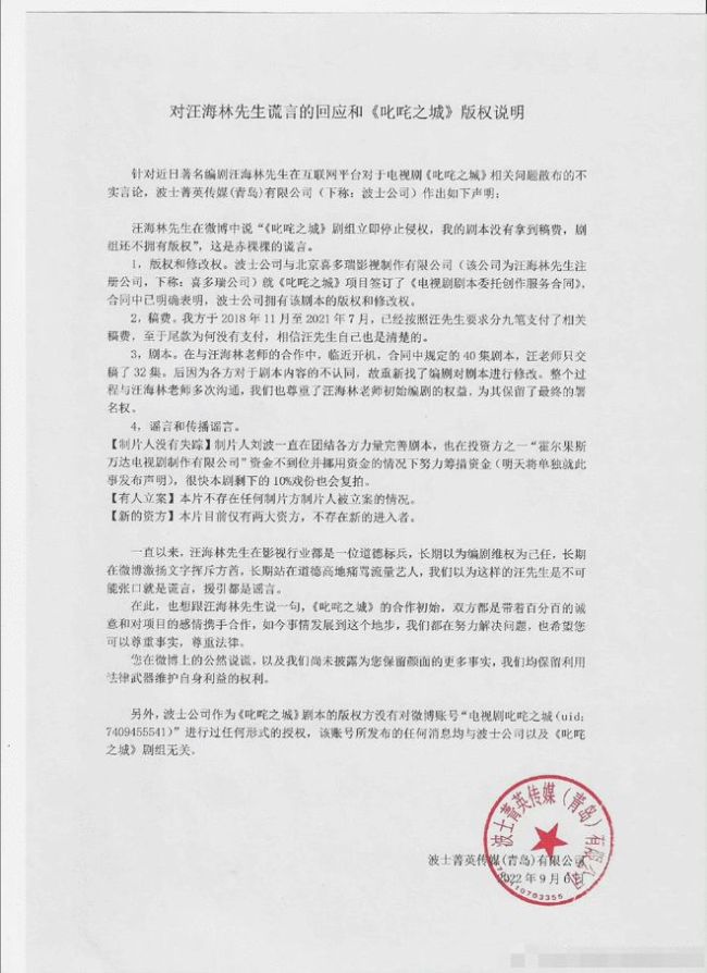 随后,电视剧《叱咤之城》制片方就编剧汪海林一系列“侵权”言论做出回应,声明片方有版权和改编权,表示不存在“制片人跑路”“作品侵权”等情况,在汪海林未交付足量剧本的前提下,制作方不仅按汪海林要求分九次支付了编剧应得稿费,也依然尊重汪海林初始编剧的权益,保留了其最终署名权。希望汪海林尊重事实,尊重法律。