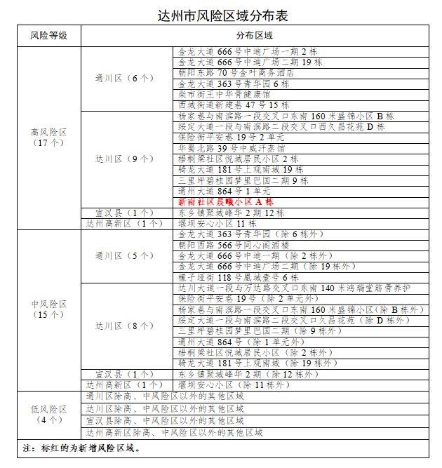 达州市疫情风险区变化及管控措施相关情况:根据《新型冠状病毒肺炎防控方案(第九版)》规定,经逐级上报审核公布,目前,达州市高风险区由16个变为17个,仅达川区新增1个;中低风险区数量及区域分布保持不变。高中低风险区疫情防控措施要求不变。