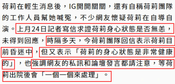 一边说着荷莉团队现在还在昏迷,另一边又说荷莉的身心状态非常健康,还强调对于外界的信息会在何莉出院后处理,似乎知道何莉一定会很快醒来。