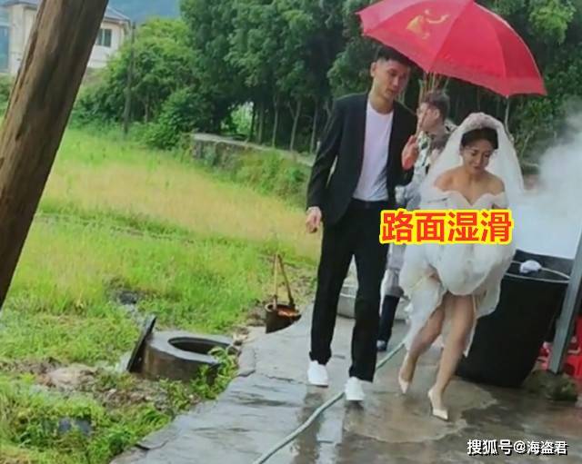 雨后的地面非常潮湿,新娘穿的婚纱裙摆会拖在地上,如果就这样走过去会把婚纱弄脏。