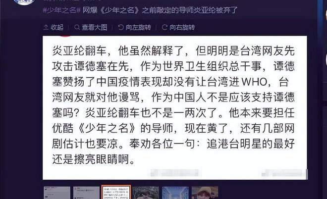 之前,他被《少年之名》节目组替换掉,按照他的说法是因为疫情。但在综艺上,自己又忍不住感慨惋惜:“钱给的真是蛮多的”。看来,炎亚纶也是被迫退出,要不然谁会和钱过不去呢?