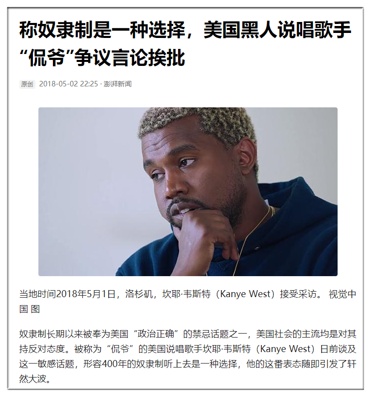 在2018年的时候,国内曾经报道过,说侃爷给奴隶制洗白。实际上,那是很多人没有理解侃爷的逻辑。