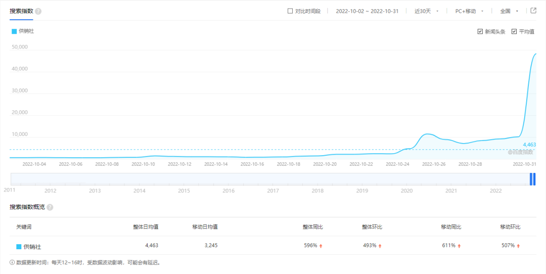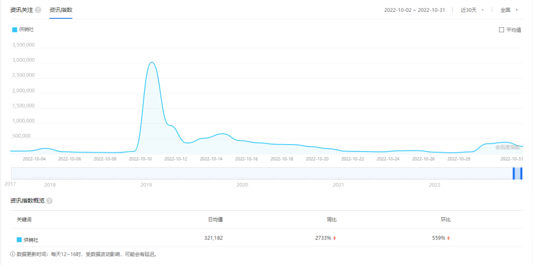 从百度数据看,过去十年间,供销社这个词的搜索和关注一直不温不火,从今年10月26日开始,这个词一下子就火了起来。然后越来越热,到今天热度还在发酵。与此同时我还关注到,从资讯来看,大规模关于供销社的新闻报道是在10月10日。那么是什么新闻在10月10日刊发,又再两周后引发舆论狂潮呢?其实“供销社”一开始的爆火,只是一次在网络平台的“文艺复兴”。我搜了搜,《烟台现“80年代供销社” 店长回应为何面貌如旧》(10月10日)今年国庆期间,一段拍摄于山东省烟台市的视频火了,视频的内容是一家名为“辉石埠供销社商店”的小店,店里的货架摆在玻璃柜台之后,买什么需要跟销售员说;洗发水挂着卖,还能打散装酱油和醋;称重用老式台秤,算账用算盘……让人感觉穿越回了上世纪80年代。