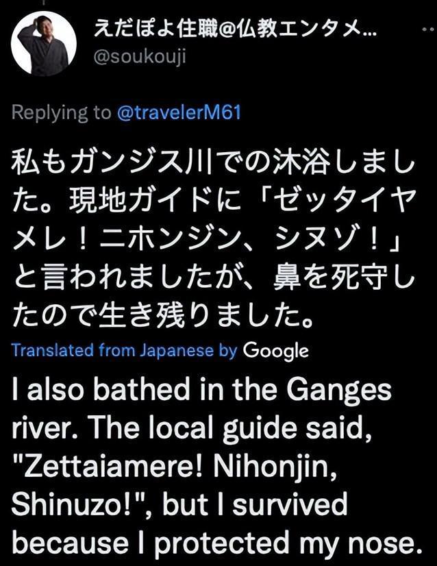 “许多病原体生活在恒河中,日本人(甚至印度人)进入恒河就会生病。 我准备好了,洗澡的风险由我自己承担。 大家永远不要模仿。”