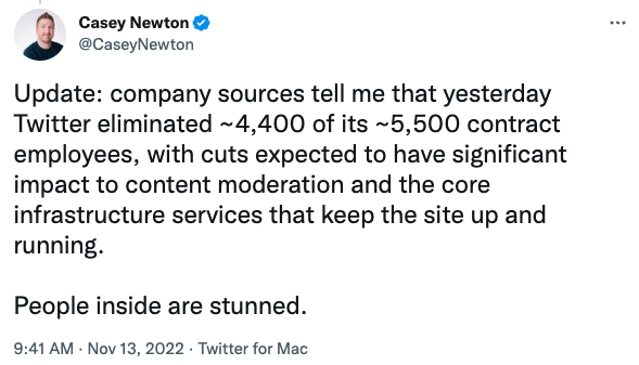 和上一次不同,这次裁的是合同工,一次性裁掉4400人。推特一共拥有合同工5500人,仅这一次被裁掉的合同工占比就高达80%。所谓的合同工,其实就是外包员工。双方不签劳动雇佣合同,签的是合作服务合同。大家都知道,在中国,外包员工和正式员工在待遇方面差别巨大。外包员工的劳动关系不在工作的公司,而在第三方人力资源公司。当企业裁员时,外包员工往往是最好欺负的对象。马斯克这是深得中国式裁员的精髓,柿子捡软的捏。推特总部员工数约7500人,我不知道这7500人是仅指正式工,还是包括5500名合同工。如果包括5500共合同工的话,这一次裁掉4400人,就裁掉推特58%的员工了。按照马斯克的规划,推特只需要保持2000多名员工就够了。裁掉合同工,马斯克表现得也极为冷漠。既没有提前通知,也没有内部沟通,而是直接发送裁员邮件。当你收到邮件时,你就被解雇了。马斯克开始露出他大资本家的冷血与无情。马斯克称:“推特每天亏损400万美元,随时面临破产倒闭的风险。”这是明显的夸大式诉苦,马斯克的真实目的是为裁员造势,为推特塑造悲情人设。传递出来的信息是,推特的状况很烂,烂透了,必须刮骨疗伤。这个“刮骨疗伤”的代价就是裁员。不裁员,推特会破产的。只有裁员,推特才能摆脱破产的风险,重新雄起。作为资本界的PUA顶尖高手,马斯克对舆论的操控能力一直处于世界顶尖水平。卖个电动车,也能造一个移民火星的伟大梦想,来拉着全球的特斯拉粉丝一起为梦想买单。大家可能会想,美国工会呢?怎么马斯克裁员,美国工会却哑巴了呢?难道美国工会被马斯克收买了吗?第一步,在舆论上疯狂造势,推特要裁员,裁员比例在80%以上。也就是说,绝大部分推特员工都会被裁掉,在推特内部不断渲染恐怖与悲观的氛围,搞得人人自危。第二步,卷人先卷中层。作为一个CEO,绝对不能轻易地直接去卷基层员工。直接卷基层,很容易触发员工的逆反心理,导致某些员工摆烂,争吵,引起公司动荡,日常工作难以开展。最好的方法是,先把中层卷起来,再让中层去卷基层,老板则躲在后面暗中观察。当马斯克宣布,要把中层也大量裁撤时,中层往往工资更高,不想失去工作。中层想要保住自己的饭碗,就必须拿着鞭子去抽基层,让基层满负荷地运作起来。谁都不想被裁,于是,中层内卷,很快就把整个推特公司都卷起来了。我们所痛恨的996,在推特变成了007。而且,推特的007还不是马斯克要求的,而是推特员工“自愿”的。既然大家都是“自愿”的,工会凭什么去插手呢?在中国,这种“自愿”式996、007,是一种相当普遍的常规现象。尤其是在深圳的软件公司,不要求加班,但是你如果在6点半准时走了,人事就会去私聊你,你是不是有离职的打算啊?有些人可能会以为这是公司在关注自己,担心自己离职。可实际上是威胁你,大家都是晚上9点才下班,你6点半就走了,你是不是不想干了?在这种暗示下,996就变成了一种“人人自愿”的新常态。经过前面两步的铺垫,推特员工工资没有变多,但是工作却更卖力了。在这个过程中,大家也潜移默化地接受了自己很可能被裁掉的现实。那么,接下来就可以进行第三步了,正式裁员。走到这一步,坚决不能犹豫了,要裁就一次裁够,不能给任何人侥幸心理。如果采取渐进式的,分批式的裁员,会让还没被裁的人人心惶惶,不利于工作地开展。但是,如果你采取一次性大规模裁员的方式,留下来的人会有劫后余生的感觉,饭碗保住了,自己是裁员下的幸运儿,不能对不起老板的恩典,工作必须更卖力!这三步走完,是不是特别像某个手机厂?舆论造势,焦虑管理,员工内卷,批量裁员,拿钱走人,都属于是教科书级别的。差别在于,手机厂的员工更有主人翁精神,而推特员工是工具人。针对被裁员的推特员工,为了避免他们找工会去闹事,马斯克也做好了悉心的准备。裁撤正式工,一次性补偿3个月工资。按马斯克的说法是,我给的遣散费已经超出美国法律规定的50%了。在实操中,马斯克又给被裁员工设计了一个无法拒绝的陷阱。这补偿金不能一次性发放,而是在你收到解雇通知的2个月后发放。为什么要这样做呢?因为美国法律要求,解雇员工必须提前60天通知,否则就是非法。但马斯克完美地规避了这条法律,你想拿到这笔遣散费,你就现在签字,但你的正式解雇日期在2个月后。同时,你同意放弃起诉推特的权利。否则,推特不会支付给你遣散费,也不会再让你上班。在这个条件下,你最好的选择就是,赶紧签字,拿钱走人,也方便找下家。不然,这边的劳动合同解除不了,还没有班上,也找不到下家,只是拖死自己而已。对正式工而言,这也算是一个比较好的结局,至少给钱爽快。但合同工就不同了,一封邮件,解除合约,一分钱赔偿都没有。收到邮件时,你就可以滚蛋了。从这就能看出,外包员工的劳动权益不仅在中国无法得到保障,在美国也一样,都是资本家随时可以丢弃的牛马。最安逸的是推特3名高管,分别是Agrawal、Segal和Gadde。他们三个人的裁退赔偿金分别为7400万美元、6600万美元和6500万美元,累计2.05亿美元。底层打工人永远是最苦逼的,在被裁员时,拿到的补偿金也不及高层一个零头。在这些周密的裁员部署下,马斯克完成了这场声势浩大的裁员计划,堪称美利坚裁员教科书。在真正的大资本家面前,美国工会的力量极为有限。因为美国法律对工人的保护底线并不高,美国工人待遇高,主