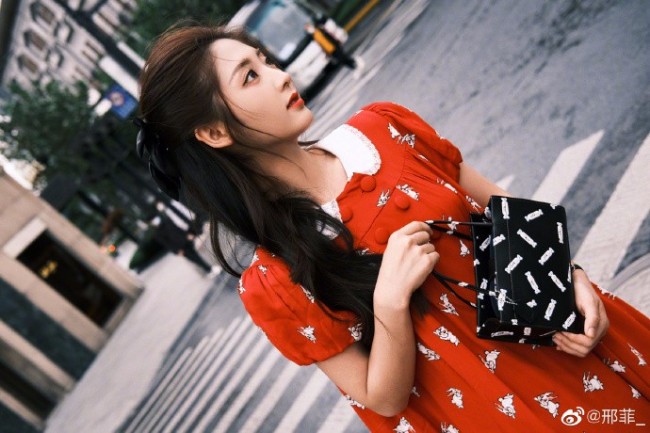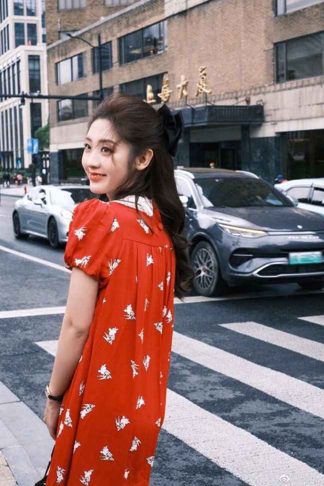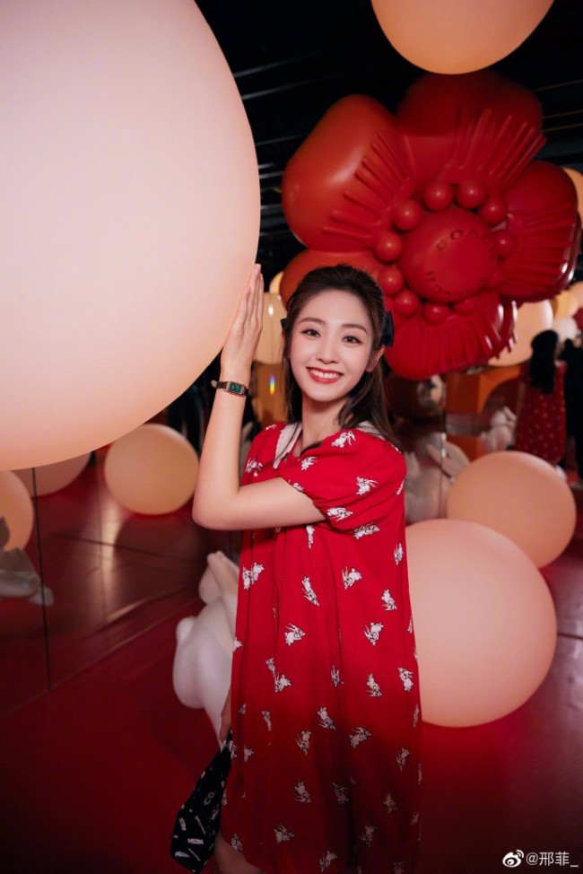 邢菲穿红裙头戴蝴蝶结 笑容灿烂又明媚
