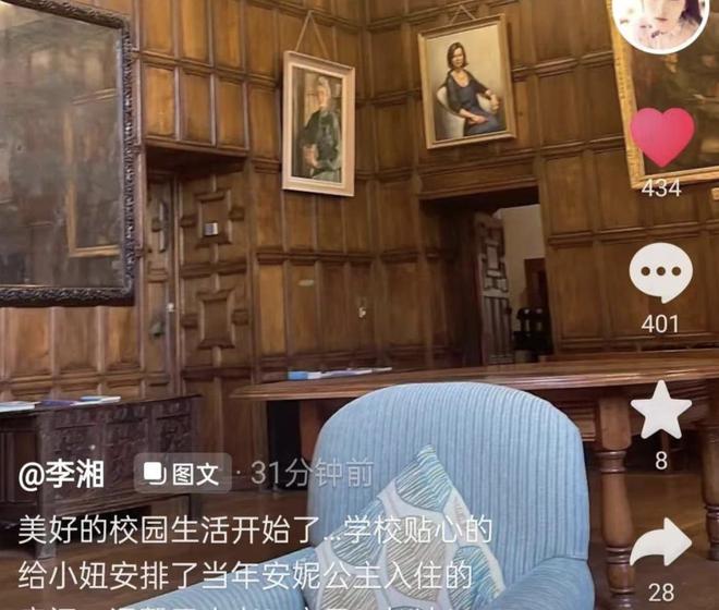 “学校贴心的给小妞安排了当年安妮公主入住的房间,温馨又古老!”