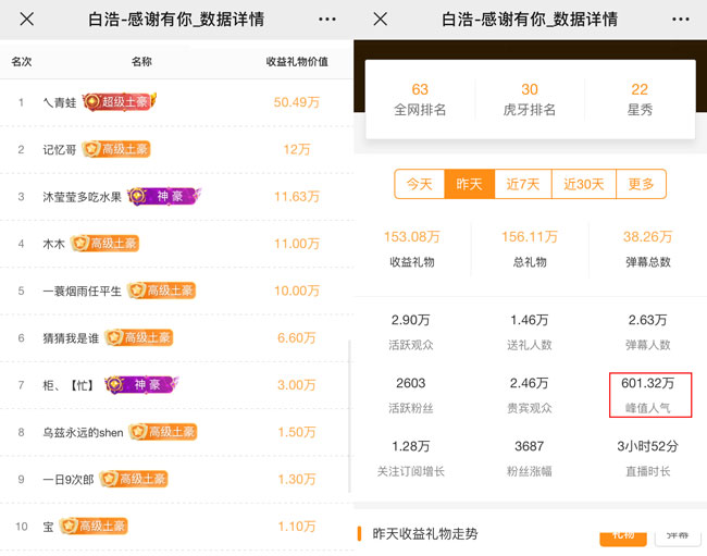 作为前YY知名主播,白浩此次虎牙首秀也是迎来了许多YY直播平台的神豪大哥豪刷支持。