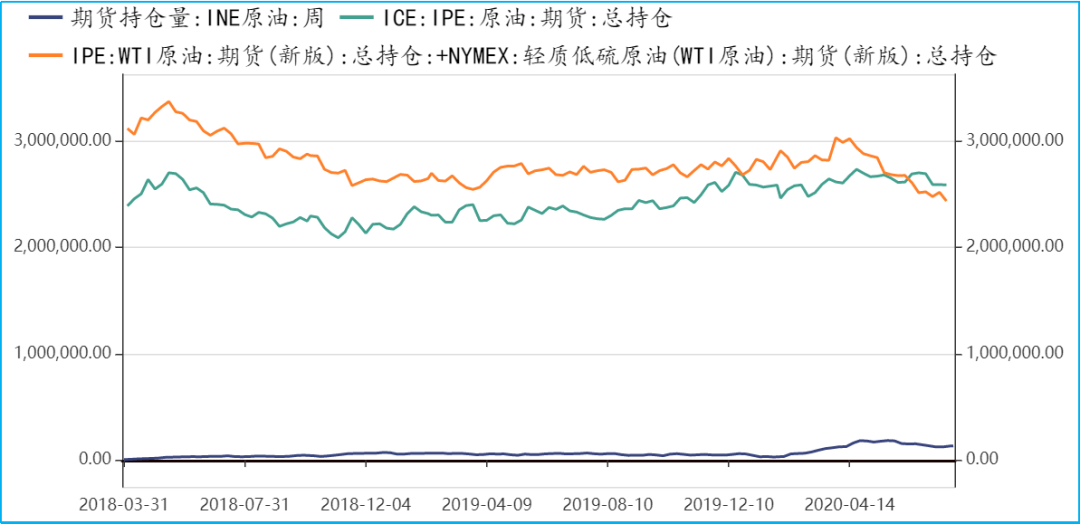 美国商品期货交易委员会(CFTC)每周公布在纽约商业交易所(NYMEX)和伦敦洲际交易所(ICE)交易的WTI原油期货持仓量。截至7月21日当周,在NYMEX交易的WTI期货总持仓196万手,在ICE交易的WTI原油期货总持仓48万手,加在一起WTI期货持仓量在244万手;在ICE交易的Brent原油期货总持仓在259万手;而在同期,在INE交易的SC(人民币原油期货的合约代号)原油期货合约持仓量在13万手左右。
