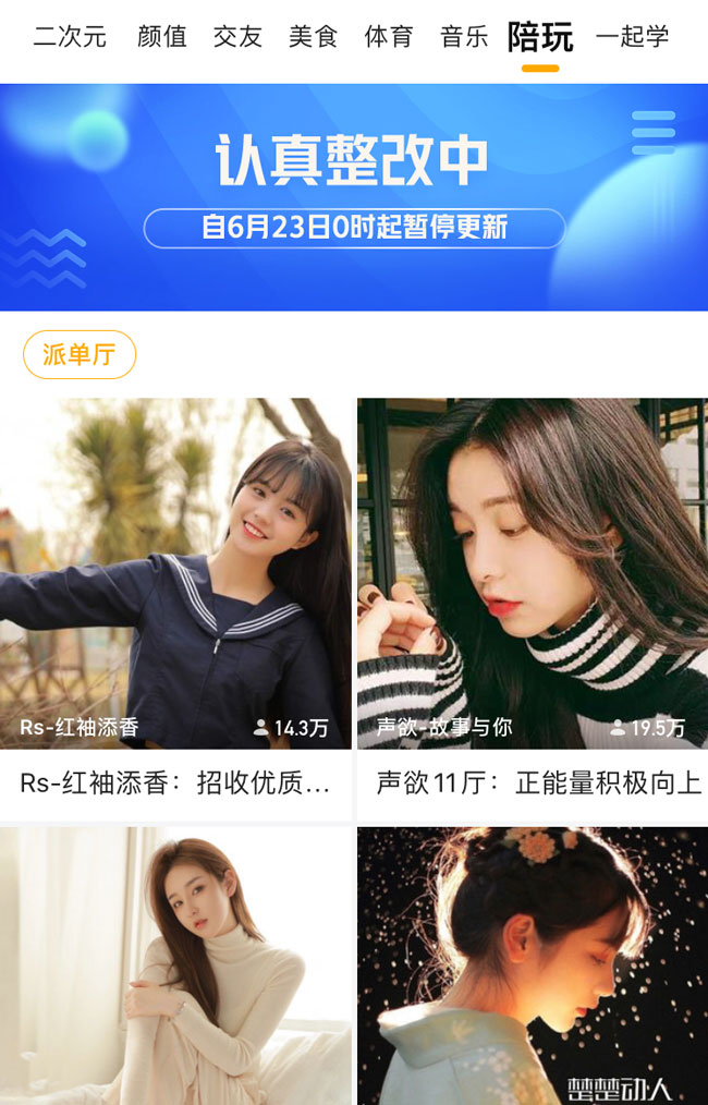 目前,在首页“推荐”频道整改后,虎牙已经对备受争议的游戏“陪玩”频道也是进行了相关内容整改。