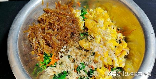 第四步:将面条菜,鸡蛋碎,粉条碎,胡萝卜丝都放入一个盆中,加入十三香适量,食盐适量,干虾皮一小把,用筷子搅拌均匀成馅料备用。