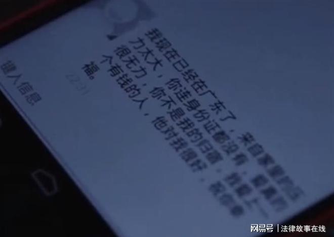 短信上写着:“我现在已经在广东了,来自家里的压力太大,你连身份证都没有,我真的很无力,你不是我的归宿,我爱上一个很有钱的人,他对我很好,祝你幸福。”
