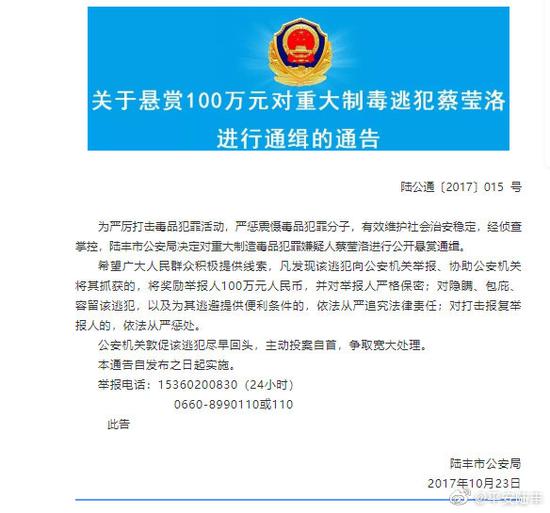 2020年9月28日16时许,在陆丰市公安机关的强力追逃下,根据群众举报,涉毒逃犯蔡莹洛(男,32岁,陆丰甲西人)被成功抓获归案。此前,陆丰市公安局曾对其悬赏100万进行通缉。