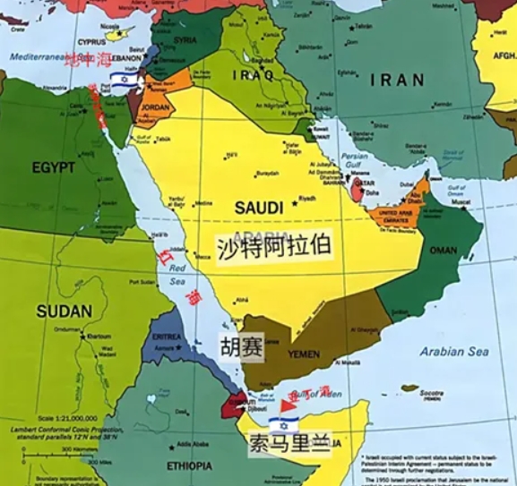 胡塞在中东的东南角,靠近印度洋。以色列在中东的西边,靠近地中海。以色列和胡塞之间的直线距离1700公里,隔着整个阿拉伯半岛。因此以色列和沙特想打对方都是非常不容易,但又彼此看对方不顺眼。
