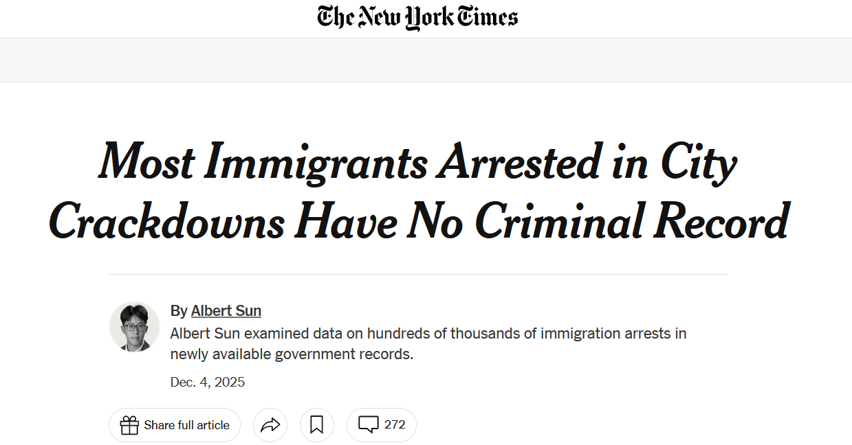 所以,在这种近乎无限执法权力的保护下,我们就可以看到移民局让美国人恐惧的另一面,也就是移民局的“战绩”。虽然表面上,移民局抓人是有理由的:为了维护美国人的安全,要抓捕犯罪的特别是暴力犯罪的移民。但是实际上,在移民局2025年羁押过的数万人中,有超过三分之一也就是75000人是没有任何犯罪记录的,超过七成的人是没有被定罪的,只有5%的人如移民局宣称的那样犯下了暴力犯罪。