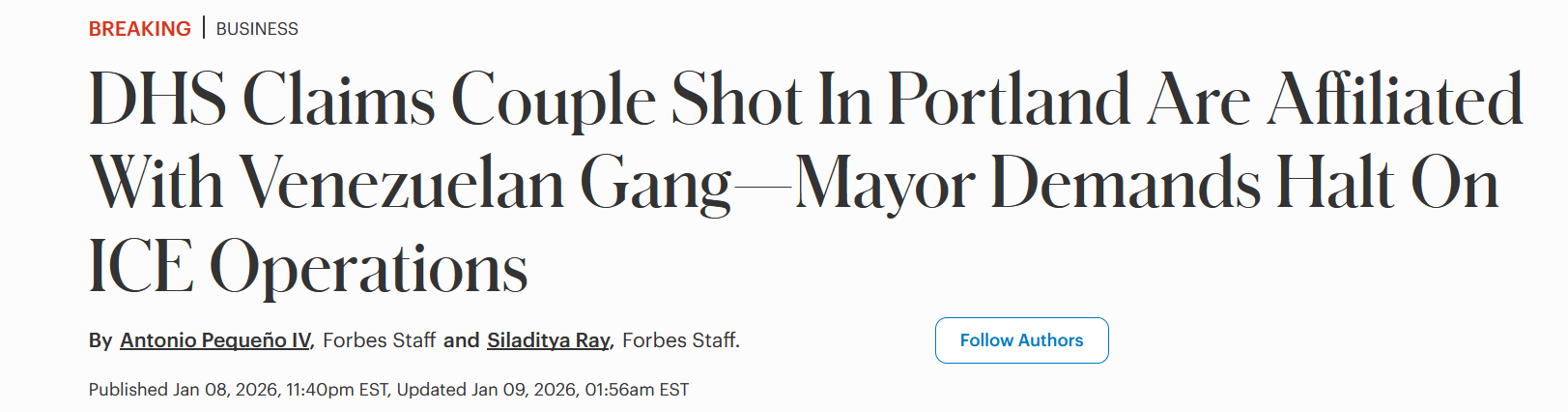 顺带一提,美国海关与边境保护局近日还在波特兰枪击了两个他们声称是委内瑞拉黑帮的移民,而波特兰的执法部门对此毫不知情,直到受伤的两人报警寻求警察帮助。前几天还为了美国绑架马杜罗而欢庆的委内瑞拉移民可能没想明白,他们跟马杜罗没有区别,都是可以拿来刷战绩的目标。当然,明尼苏达发生的事情告诉大家,不只是委内瑞拉“润人”,每个美国人都可能是刷战绩的目标。