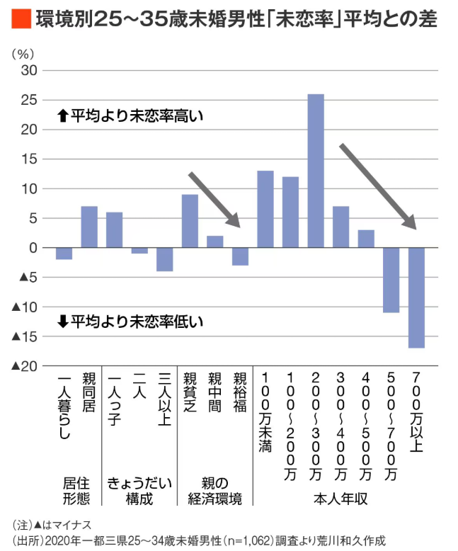 毕竟,他们或许连考虑的机会都没有:东洋经济分析显示,过去10年间,年收入300万—500万日元阶层的婚姻数急剧下降,甚至有些人一辈子连恋爱都没谈过。