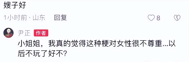有人觉得尹正这次太上纲上线,他可以不喜欢网友这么叫他,也可以批评网友口无遮拦,但不该用“不尊重女性”这样的理由。