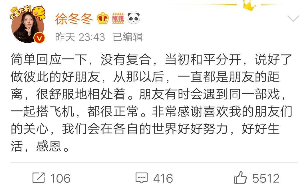 期间也曾拍到两人有说有笑一起共进晚餐的画面,还被怀疑复合,但很快就被徐冬冬发声否认,称两人只是正常相处。
