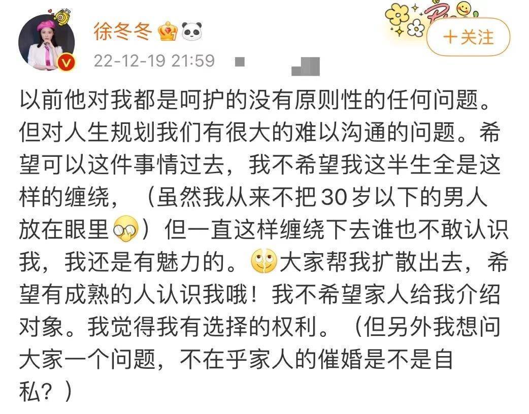面对网上层出不穷的议论,徐冬冬不再隐忍,在12月19日晚发文回应,称两人目前依旧是分手状态,并承认之前曾有过复合,但两人现在是两个世界的人了,还表示自己已经取关了有关他的所有内容,不惜放狠话在线征婚。